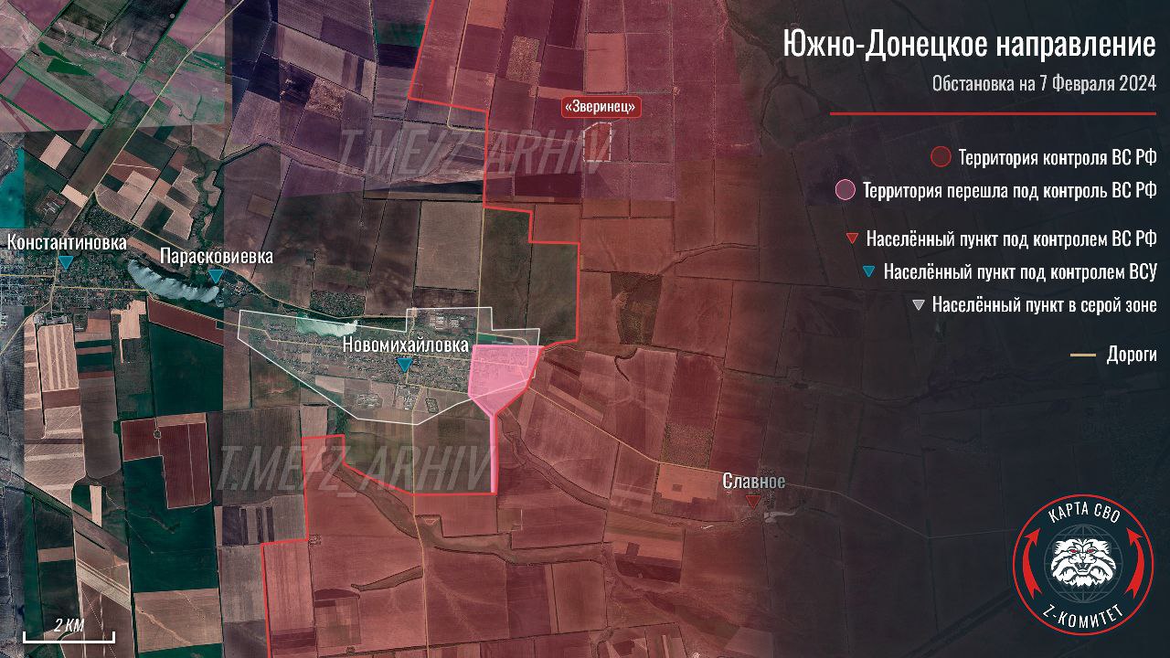 Поступают сообщения из посёлка Новомихайловка, расположенного в 8 км южнее Марьинки, за который давно идут бои. Нашим бойцам удалось закрепиться на восточных окраинах посёлка. Кроме того, ВС России зашли в н.п. ещё с одного направления и закрепляются на южных окраинах, пишет военкор Тимофей Ермаков.