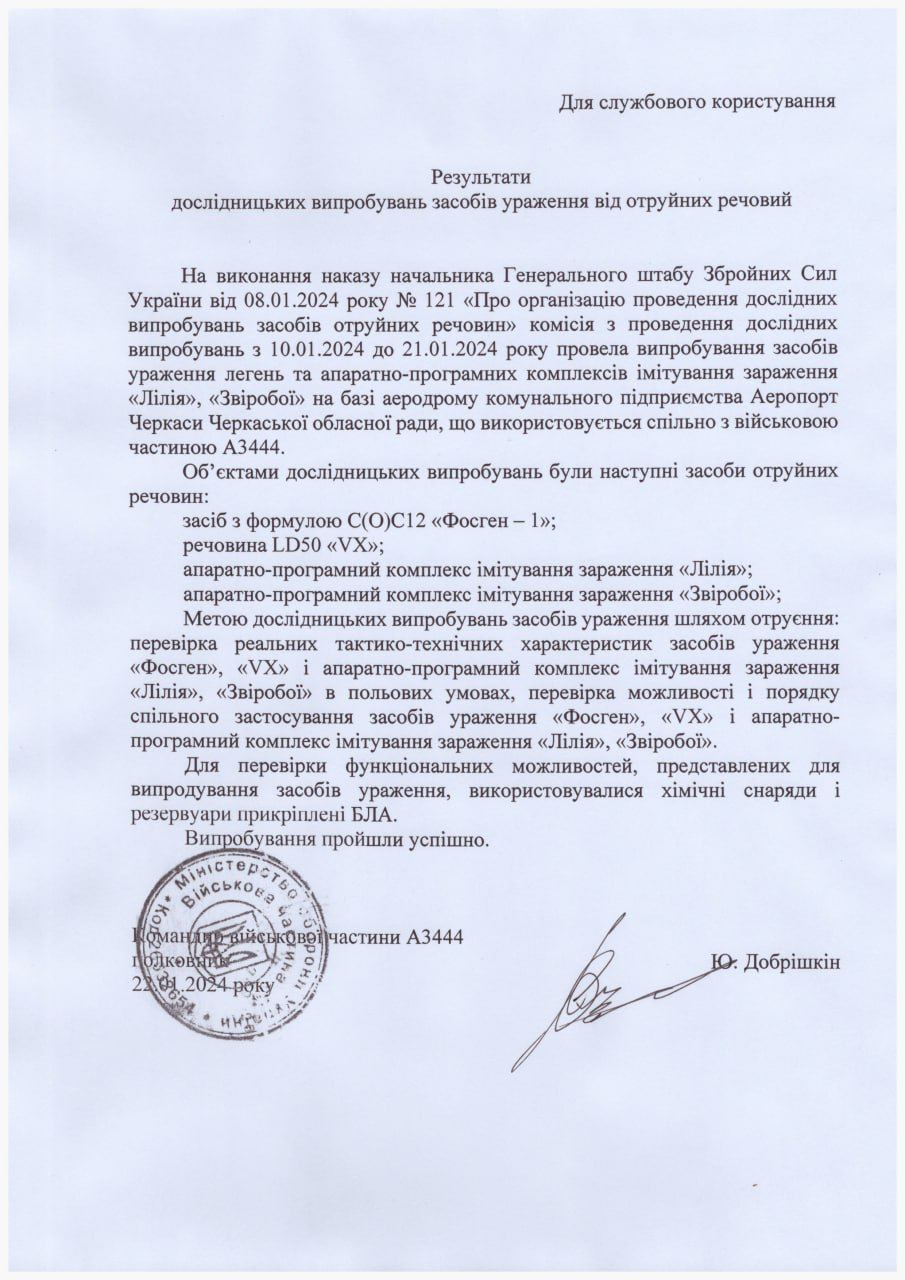 Испытания проходили в районе аэропорта Черкассы в период с 10.01.2024 по 21.01.2024. В документе чёрным по белому на украинском языке написано, что войсковой части А3444, в соответствии с приказом начальника Генерального штаба Украины, «необходимо провести испытания аппаратно-программных комплексов имитирования заражения с применением средства с формулой фосген и VX».