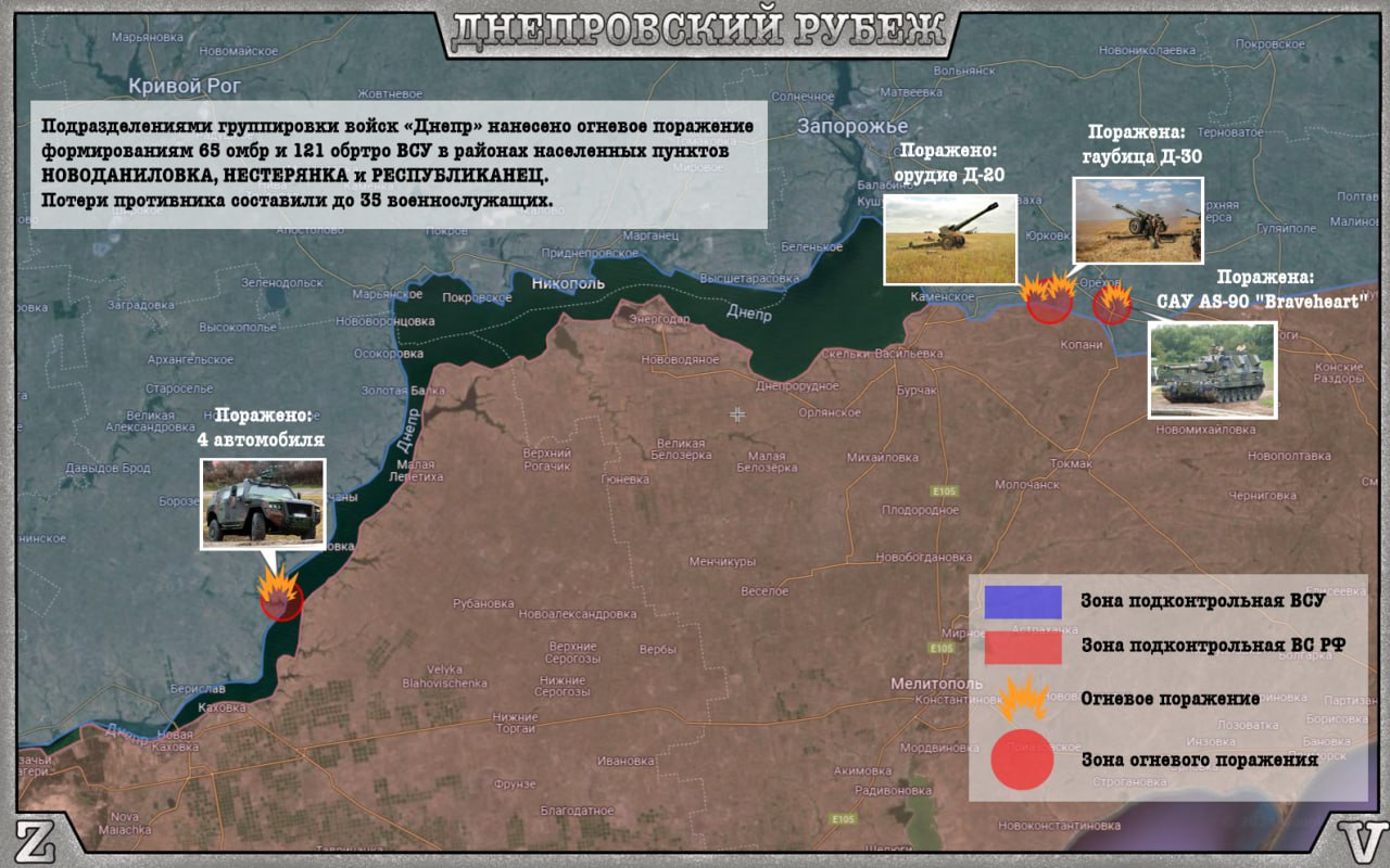 Потери ВСУ составили до 35 военнослужащих, четыре автомобиля, 155 мм самоходная артиллерийская установка AS-90 «BraveHeart» производства Великобритании, 152 мм орудие Д-20 и 122 мм гаубица Д-30, пишет Телеграм-канал Днепровский Рубеж.