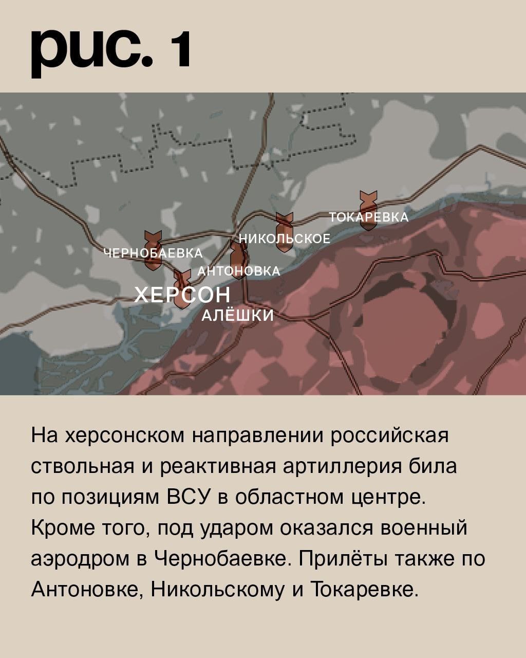 На херсонском направлении российская ствольная и реактивная артиллерия била по позициям ВСУ в областном центре. Кроме того, под ударом оказался военный аэродром в Чернобаевке. Прилёты также по Антоновке, Никольскому и Токаревке, пишет Телеграм-канал Новости Херсонщины