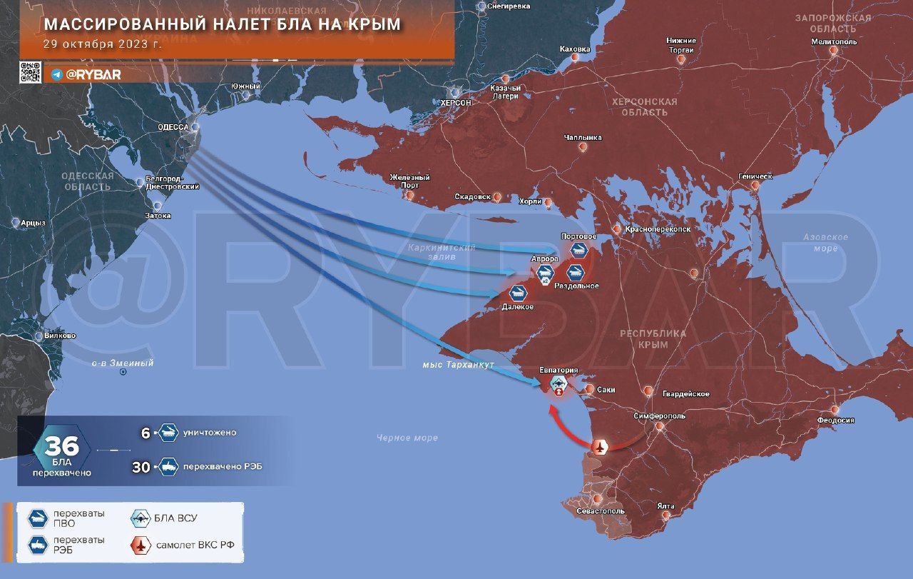 Ночью 29 октября украинские формирования спустя длительное время атаковали полуостров Крым беспилотниками. Из окрестностей Одесской области было запущено не менее 36 единиц БЛА неустановленного типа.
