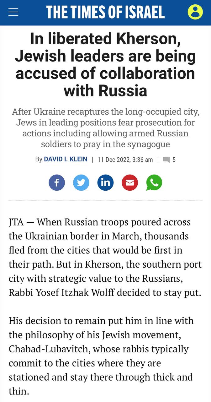 Как пишет израильская газета The Times of Israel раввина Йосифа Ицхака Вольфа и по совместительству главы общины возникли серьёзные проблемы. А всё из-за того, что он позволял российским военнослужащим иудейского вероисповедания молиться в местной синагоге. Он же в свою очередь заявил, что остаться в Херсоне вместе со своими подопечными после вступления в город российской армии его заставила философия движения Хабад-Любавич.
