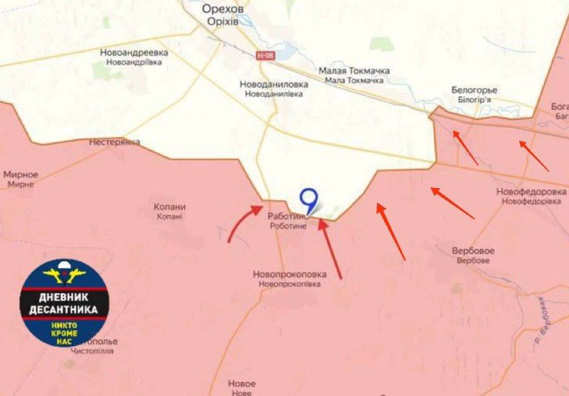 – Одновременно с этим пехотные отряды 46 оаэмбр ДШВ Украины атаковали позиции ВС РФ прямо у восточной окраины Работино, используя плацдарм в посадке в 1 км от села. Аналогичный трюк они попытались провернуть вчера, заняв дома на северо-востоке, где их и накрыла артиллерия.