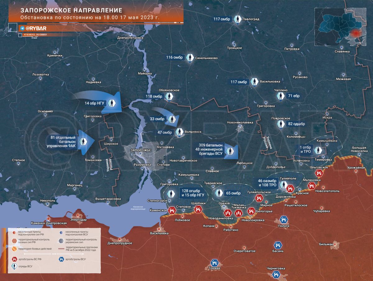 В Запорожской области в Вольнянск прибыли подразделения 33 и 47 механизированных бригад 9 АК. На передовой заняли позиции формирования 128 огшбр и 15 обр НГУ, 65 омбр, 46 оаэмбр и три бригады ТРО.