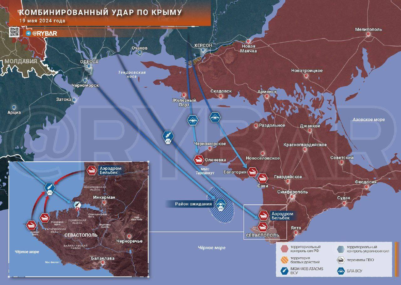 Ночью 19 мая, ВСУ вновь провели атаку на Крым. Изначально в направлении полуострова были запущены беспилотники с нескольких сторон, работа по которым отмечалась и у Тарханкута, и у Евпатории.