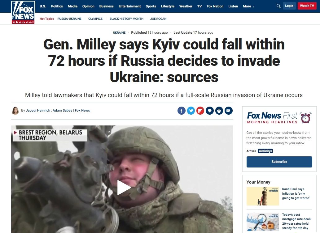 А в другом материале, опубликованном там же, Глава Объединённого комитета начальников штабов США генерал Марк Милли гневно спорит с теми, кто отводит сопротивлению ВСУ всего 48 часов. Такого не может быть, с нашей военной помощью  украинские солдаты продержатся все 72 часа, уверяет генерал. По его прогнозам, потери ВСУ составят до 15 тысяч человек, российской армии – до 4 тысяч. Тоже духоподъёмный такой прогноз…