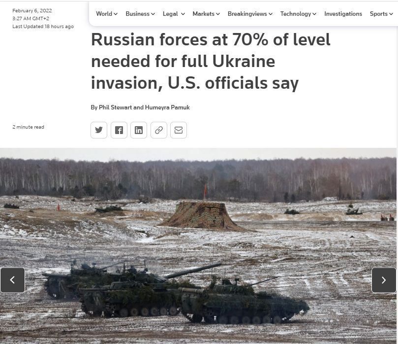 Американская разведка уверяет – российская армия собрала на украинской границе 70% сил и средств, необходимых для начала широкомасштабного наступления, осталось подвезти всего 30% – и вперёд, на Киев! Да и маршрут уже известен, какой дорогой пойдут псковские десантники и бурятские бронетанковые войска, ничего не скроешь от американских разведчиков.