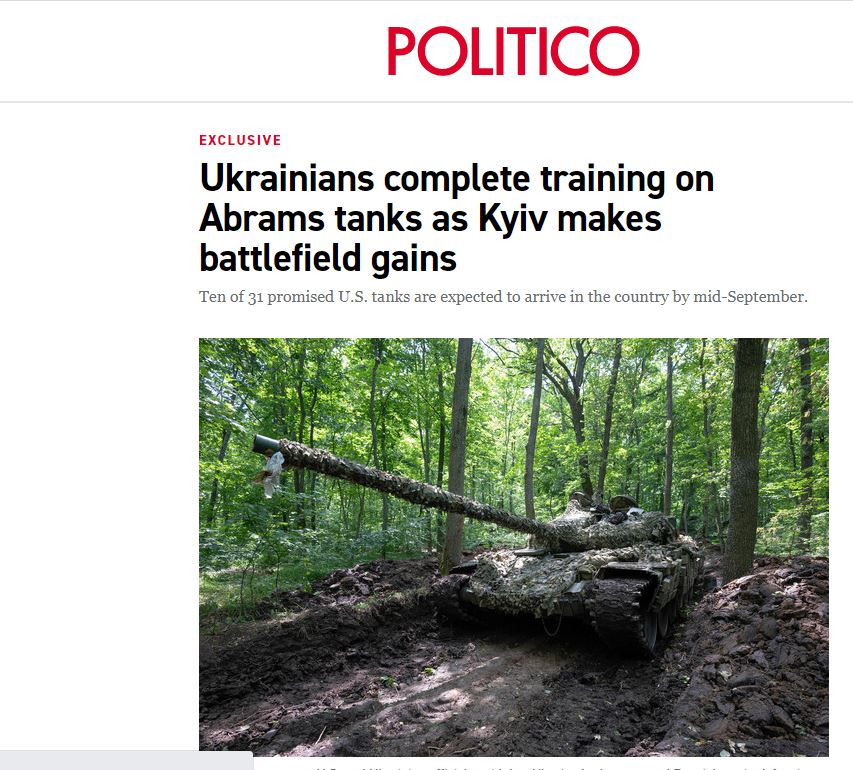«Украина должна получить первые десять из 31 обещанного танка Abrams в середине сентября, по словам представителя Министерства обороны, попросившего сохранять анонимность в беседе с корреспондентами издания. Западные официальные лица надеются, что прибытие танков даст киевским силам преимущество, необходимое для прорыва обороны России. Десять 70-тонных танков в настоящее время находятся в Германии на завершающем ремонте, сказал представитель Министерства обороны. Как только ремонт будет завершен, они будут отправлены на Украину»,