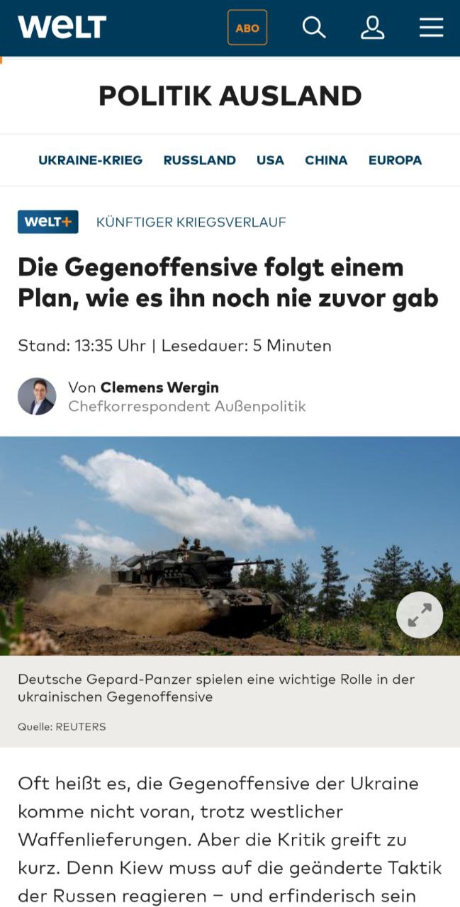 «В течение первой фазы украинского контрнаступления, начавшегося месяц назад, ВСУ действовали в полном соответствии с учебниками армии США: они наносили удары крупными силами. Но, как оказалось, россияне были хорошо подготовлены именно к такому наступлению. В этом состоит причина того, что первая фаза украинского наступления провалилась, и сегодня уже можно с уверенностью говорить об этом», – цитирует Die Welt военного эксперта.