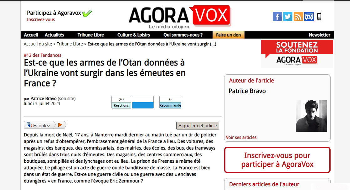 Французское интернет-издание AgoraVox предупреждает: переданное Украине вооружение рано или поздно всплывёт в Европе. Так, например, у участников массовых беспорядков во Франции изымается натовское оружие, следы которого ведут на Украину.