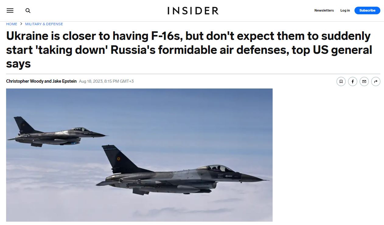 «Хотя Киев неоднократно просил передать ему истребители F-16, в Соединённых Штатах призывают не рассчитывать, что получение истребителей позволит ВСУ перехватить инициативу на поле боя. F-16, конечно, дадут Украине дополнительные возможности, но они не справятся с противовоздушной обороной России. Всех, кто рассчитывает на обратное, ждёт разочарование. Российские войска быстро адаптируются к поставляемому на Украину западному вооружению, точно также они приспособятся и к американским истребителям. Даже на F-16 не удастся подобраться достаточно близко к цели, так как эти истребители с большой вероятностью могут сбить российские ракеты класса «земля-воздух», – цитирует Business Insider генерала ВВС США Джеймса Хекера, давшего интервью этому изданию.