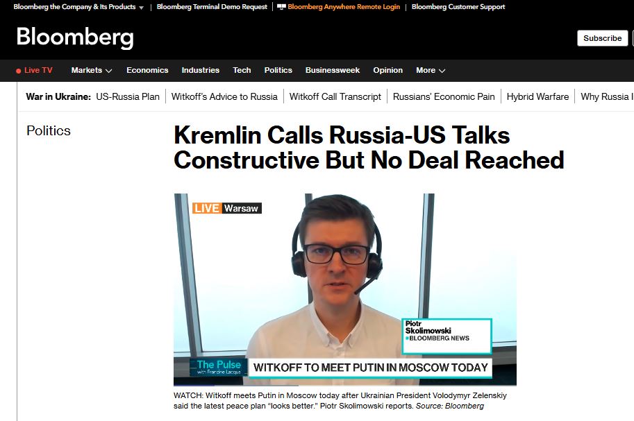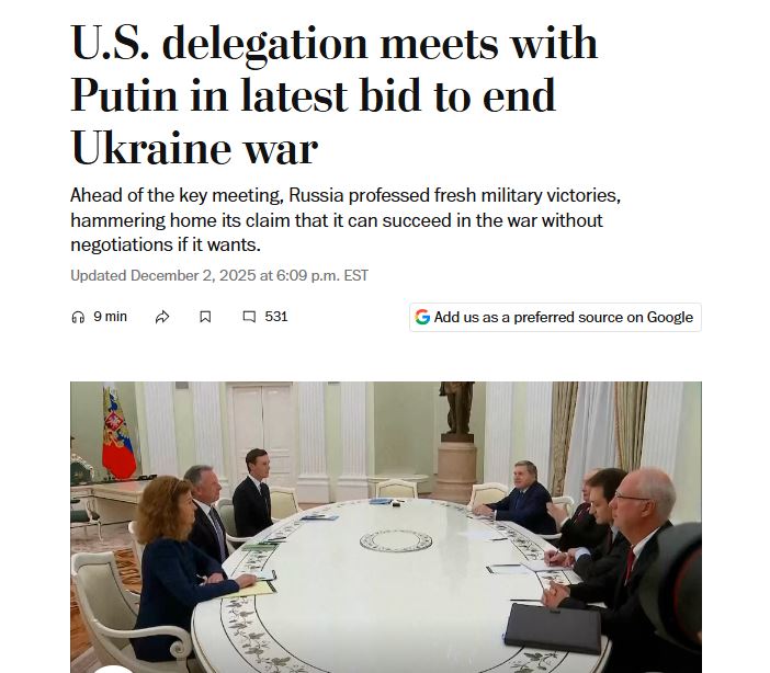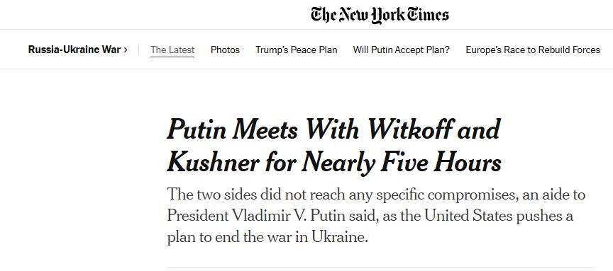 После встречи в Кремле Кушнер и Уиткофф отменили запланированную ранее встречу с Зеленским в Брюсселе, поскольку обсуждать на этом этапе нечего. Чем сильно рассердили европейцев, поэтому западные СМИ принялись жаловаться, что ситуация развивается «по плану Путина». При этом каждое издание выдаёт свою версию переговоров. Правда, жалуются не все – некоторые из реальности не выпадают.