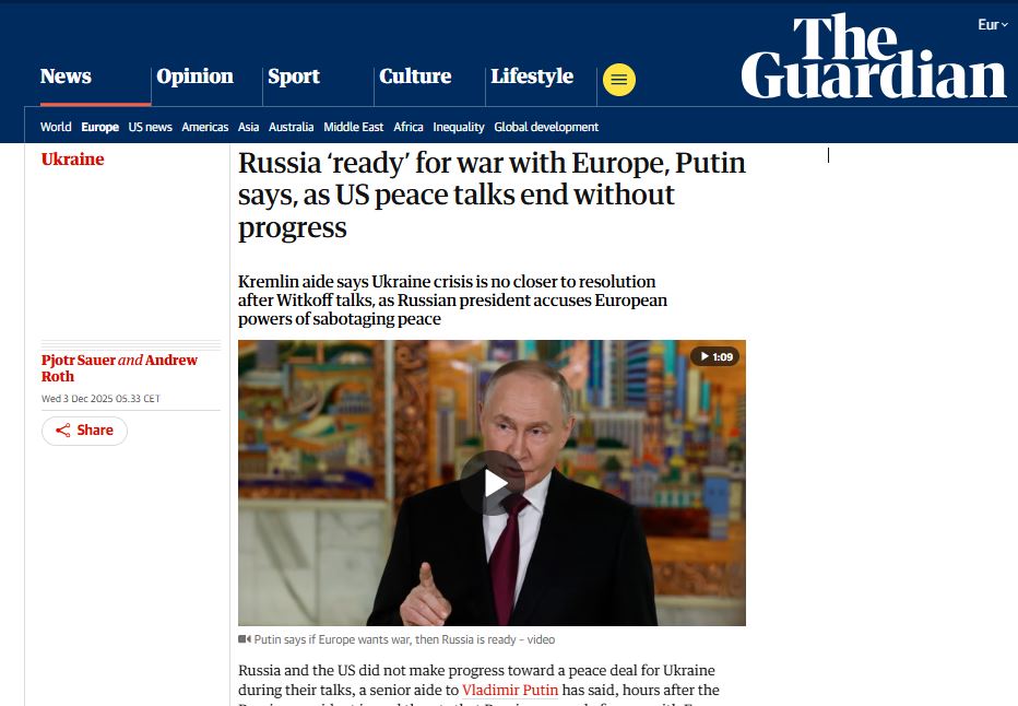 А британскую газету The Guardian похоже всерьёз испугали слова Путина о том, что Россия готова ответить на желание Европы повоевать.