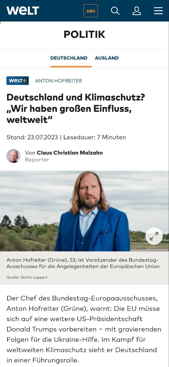 Глава комитета бундестага по европейским делам и один из лидеров немецких зелёных Антон Хофрайтер (Anton Hofreiter) призывает усилить поддержку Украины, в том числе и вооружением. Интересно, что раньше зелёные называли себя пацифистами, а сегодня громче всех требуют отправить оружие Киеву.