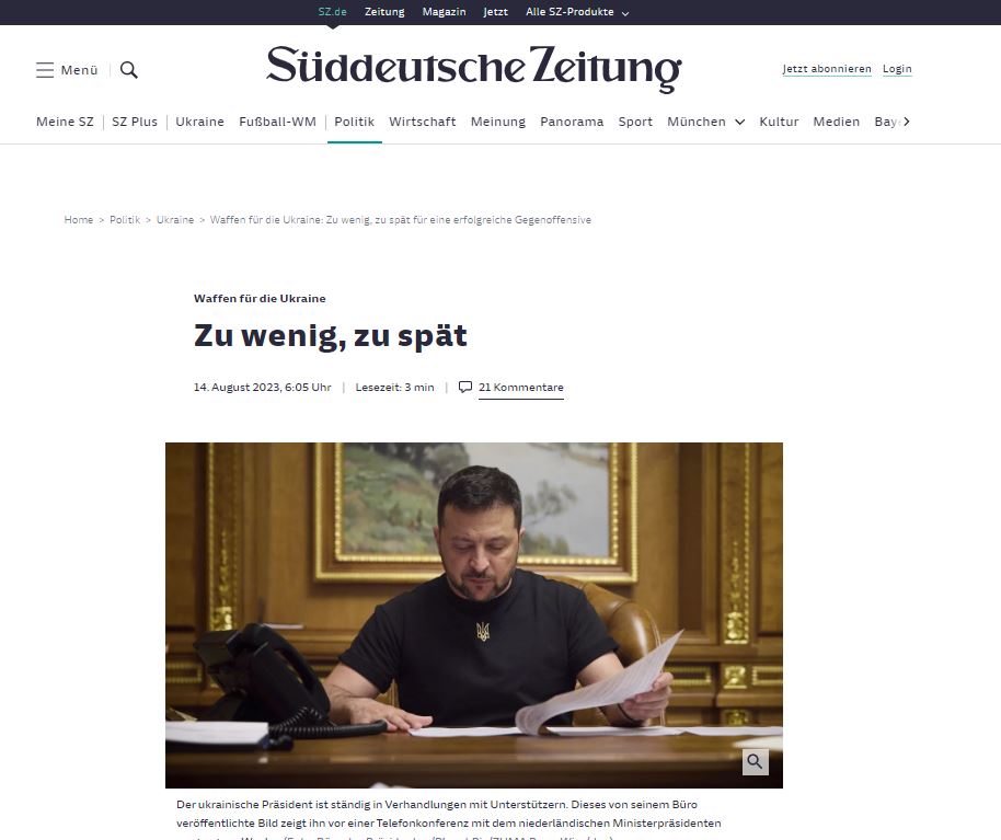 Западным экспертам заранее было известно, что Киев потерпит поражение в наступлении. Немецкая газета Süddeutsche Zeitung обвиняет весь коллективный Запад в том, что он не смог обеспечить масштабные военные поставки для украинской армии, из-за чего та не смогла показать удовлетворительных итогов наступления.