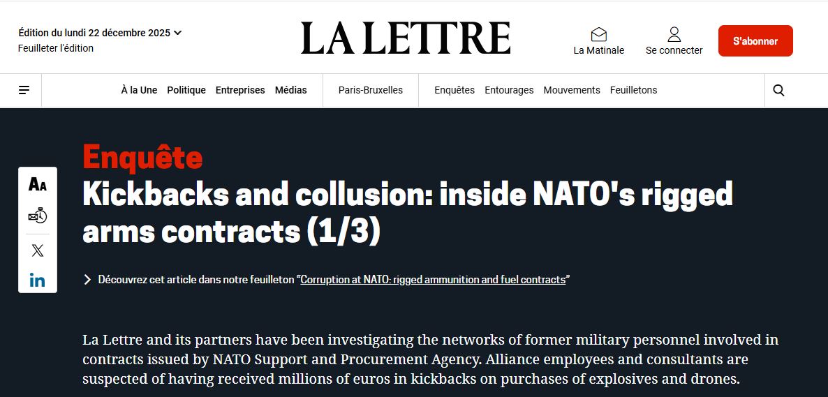Французская газета La Lettre объясняет, что масштаб коррупционного скандала в самом альянсе обусловлен тем, что NSPA поставляет все компоненты членам военного блока и странам-партнёрам – от систем вооружения и боеприпасов до материально-технического обеспечения, включая поставки топлива и даже услуги общественного питания.
