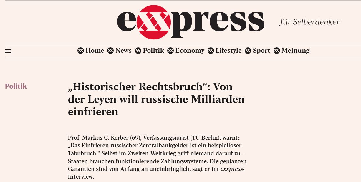 Тем временем известный немецкий экономист и политолог профессор Маркус Кербер напомнил о том, что замораживание средств Центрального банка России является беспрецедентным нарушением табу. Даже во время Второй мировой войны не прибегали к подобным действиям. Но сегодня Еврокомиссия настаивает на противоправных действиях, всё быстрее превращаясь в «брюссельскую диктатуру», постоянно нарушающую демократические права национальных государств, рассказал профессор в интервью австрийскому изданию Exxpress.