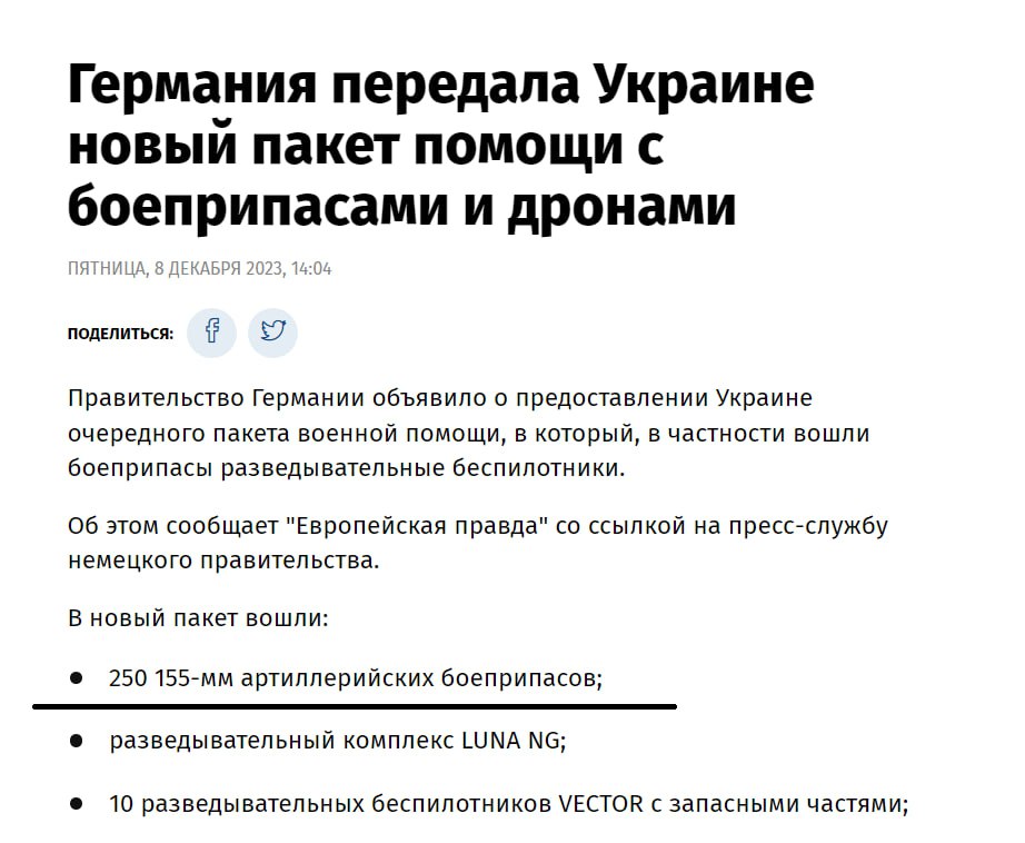 Это такой новый пакет военной помощи Украине от Германии, о котором объявили в ФРГ. В этот новый пакет вошли 250 штук 155-мм артиллерийских снарядов. А ещё пообещали прислать из Германии 70 автоматических гранатомётов калибра 70 мм, разведывательный комплекс и целых десять беспилотников.