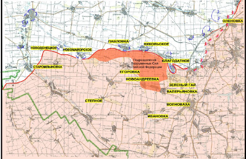 Министерство обороны РФ: Вооруженные Силы Российской Федерации, продолжая наступление на широком фронте установили контроль над населенными пунктами НОВОАНДРЕЕВКА, КИРИЛОВКА и вышли на рубеж НОВОМАЙОРСКОЕ – ПАВЛОВКА – НИКОЛЬСКОЕ – ВЛАДИМИРОВКА – БЛАГОДАТНОЕ.