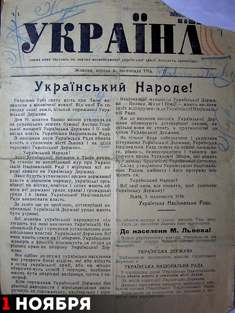 В ночь на 1 ноября 1918 года во Львове было объявлено об образовании Украинской державы (УД) на территориях, на которые претендовал Украинский национальный совет. В отношении этого события в современной украинской историографии стали применять термины «Ноябрьский чин», «Ноябрьская революция», «Первоноябрьское восстание»… Заканчивалась Первая мировая война, 11 ноября капитулировала Германия. Империя Габсбургов (Австро-Венгрия) разваливалась. 13 ноября объявленной УД с претензией на землю в 70 тыс. кв. километров (территории Восточной Галиции, Буковины и Закарпатья)  дали название «Западноукраинская народная республика» (ЗУНР). Польша начала боевые действия за включение Восточной Галиции в свой состав. 21 ноября польские войска взяли Львов, руководство ЗУНР было вынуждено бежать в Тернополь, потом в Станиславов (с 1962 года Ивано-Франковск). В ноябре румынские войска вошли в столицу Буковины Черновцы. А 15 января 1919 года столица Закарпатья (Ужгород) была занята чехословацкими войсками. По Акту злуки ЗУНР с УНР от 22 января 1919 года, Западноукраинскую народную республику превратили в автономию и стали именовать «Западные области Украинской народной республики» (ЗОУНР). В конце 1919 года Акт злуки со стороны ЗОУНР был денонсирован. А 21 апреля 1920 года Петлюра (УНР) договорился с Варшавой о том, что граница с Польшей должна проходить по реке Збруч. А за территорию ЗУНР (ЗОУНР) Петлюра выторговал у Польши помощь в борьбе с Советами и большевиками. Во второй половине 1921 года почти все территории объявленной (провозглашенной) ЗУНР остались в Польше, кроме территорий, вошедших в состав Чехословакии и Румынии. Лига Наций в 1921 году признала, что Восточная Галиция находится под польской военной оккупацией и осудила антиукраинскую политику варшавского руководства, а в 1923 году признала вхождение галицких земель в состав Польши без всяких оговорок.
