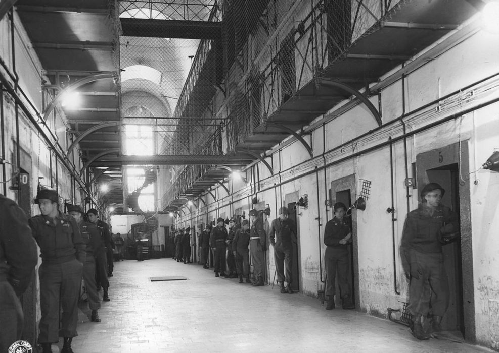 Коридор тюрьмы Нюрнберга, где содержались главные нацистские преступники. Круглосуточное наблюдение за ними вели американские военнослужащие, охранявшие тюрьму