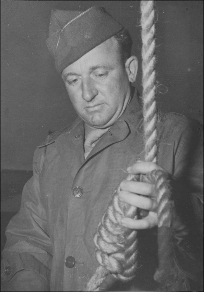 Американский мастер-сержант Джон Вудз (John Clarence Woods, 1911 – 1950) готовит петлю для приговоренного на Нюрнбергском процессе.