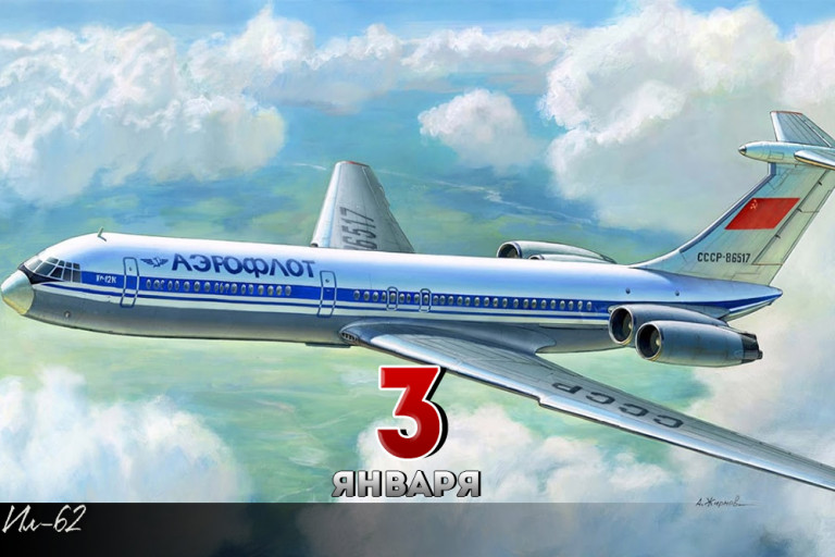 3 января 1963 года в СССР состоялся первый полет самолета Ил-62. Последнее детище авиаконструктора С.В.Илюшина. Дальнемагистральный самолет мог совершать беспосадочные перелеты на дальность до 10 тыс. км. С 1967 года, после успешных испытаний, начались регулярные полеты по Советскому Союзу, а потом были рейсы в Прагу и Монреаль. Всего было выпущено 276 самолетов. Последний борт был построен в 2004 году для правительства Судана. К 2014 году в эксплуатации оставалось около 20 Ил-62 в России, Украине, КНДР, Судане, Ливии и Гамбии. Самолёты используются для выполнения правительственных, грузовых и чартерных рейсов.