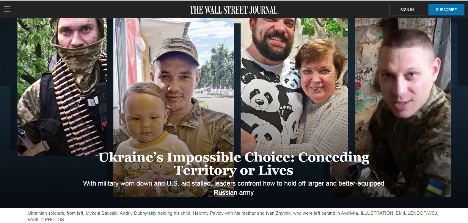 После того как украинская армия оставила свои позиции в Авдеевке – городе, который считался неприступной крепостью, – перед ВСУ встала задача выстроить новую линию обороны к западу от Авдеевки, причём сделать это необходимо как можно быстрее и под постоянными обстрелами российской артиллерии. Задача практически невыполнимая, считает американская деловая газета The Wall Street Journal (WSJ). И сегодня перед Генеральным штабом ВСУ стоит непростой выбор – пытаться удерживать территорию любой ценой или всё же сохранить личный состав, который тает на глазах. Ситуация поистине тупиковая, отмечает издание.