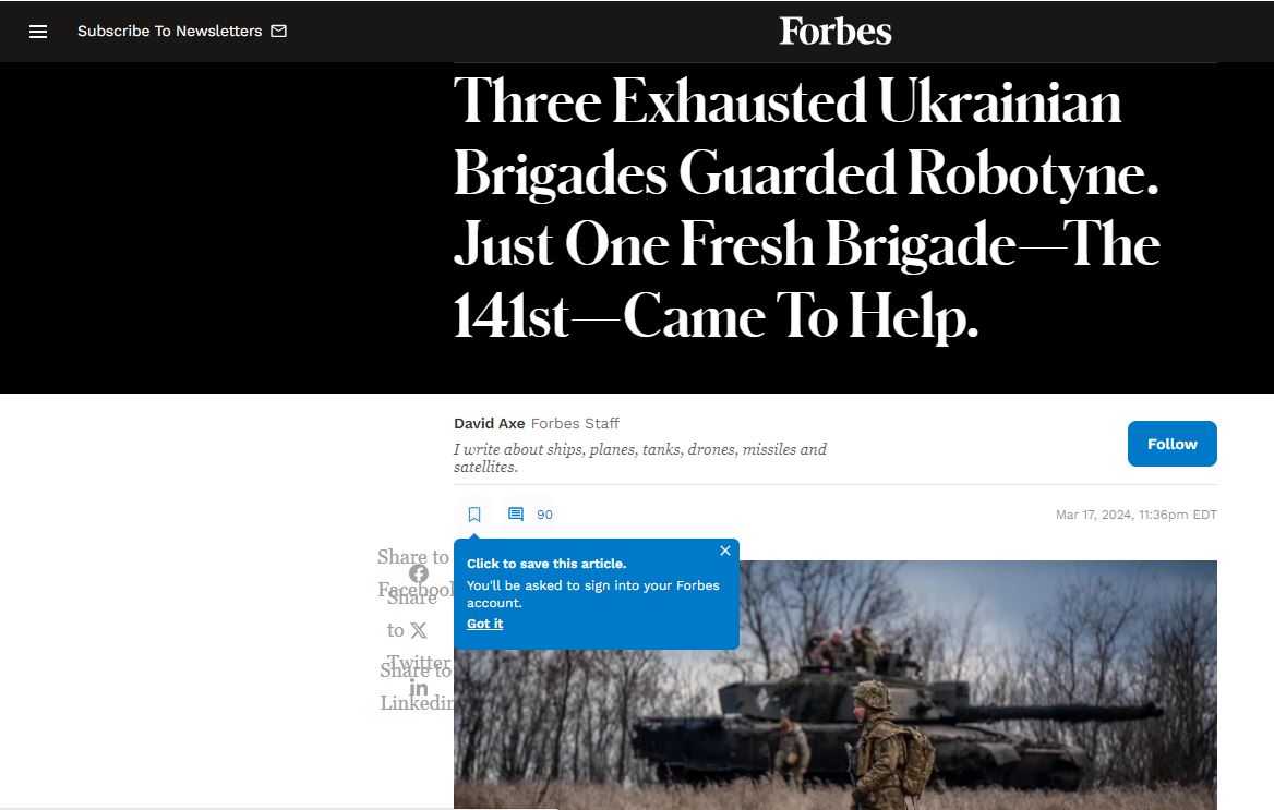 «Катастрофическая нехватка тяжёлой техники у бригады напоминает, что, понеся тяжёлые потери в наступлении летом прошлого года, украинские военные изо всех сил пытаются равномерно оснастить все свои бригады танками, боевыми машинами и артиллерией. Однако всё это на самом деле не является самыми насущными потребностями Киева, ключевой же проблемой является нехватка людей. Дефицит живой силы на Украине, скорее всего, исчисляется десятками бригад. Таким образом, хотя 141-я и другие новые бригады могут укрепить оборону Украины на нескольких участках, но их слишком мало, чтобы полностью заменить уставшие и истощённые бригады. К тому же все подразделения ВСУ должны оставаться на линии фронта до тех пор, пока политики в Киеве, наконец, не примут новый закон, который может мобилизовать сотни тысяч свежих военнослужащих», – пишет Forbes. Заметим, что журнал говорит о жителях Украины так, как будто они – расходный материал, не более. Что, впрочем, так и есть.
