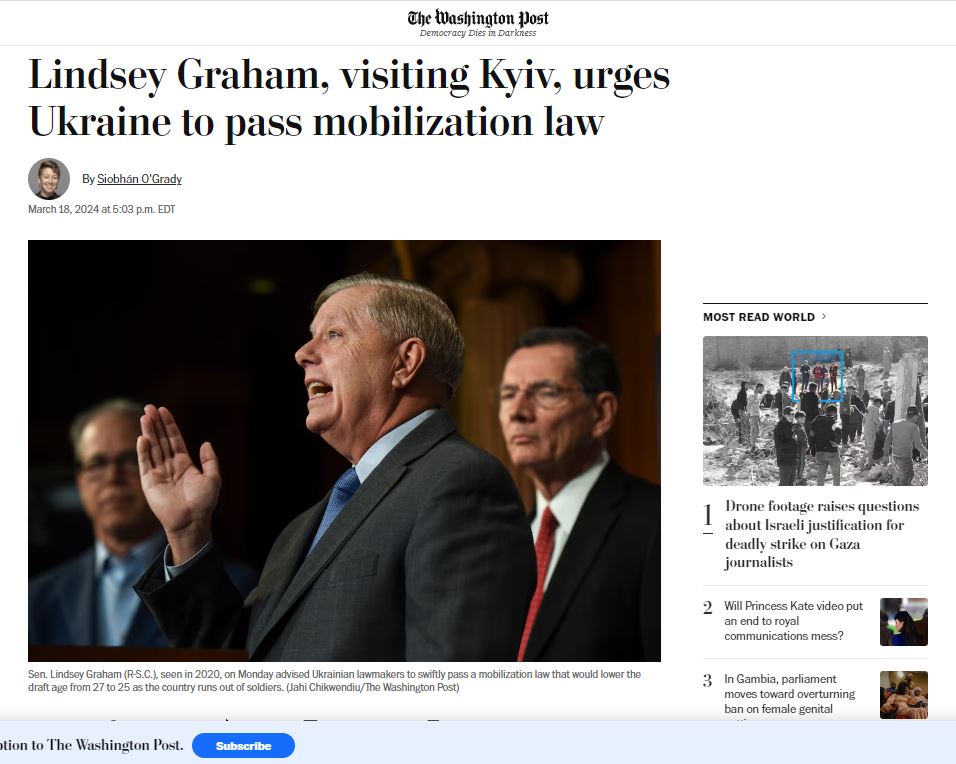 Грэм прибыл в Киев с наблюдательной миссией, и его возмутила проблема мобилизации, когда на Украине военкомы не могут найти мужчин, которых можно было бы отправить на фронт.