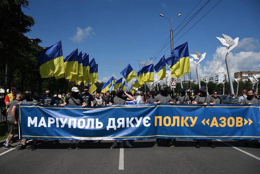 «Азовцы» максимально использовали для саморекламы «празднование годовщины освобождения Мариуполя», где прошел марш полка и свезённых со всей Украины нацистов под плакатами «Мариуполь благодарит полк Азов» и «Поддерживаем полк Азов».