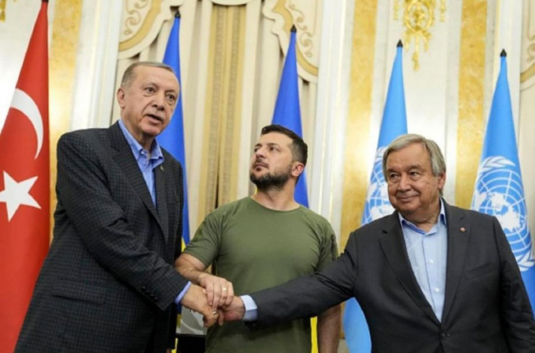 Договариваться с Зеленским приехали глава никчемной ООН Гутерриш и «байрактарный миротворец» Эрдоган, ради которого столичные креативщики карго-культа разбили на проспекте Бандеры клумбу «Байрактар».