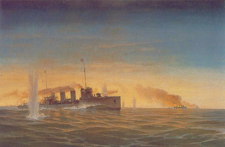 Заглавная иллюстрация. Бой эскадренного миноносца «Новик» с германскими эсминцами «V-99» и «V-100» в Рижском заливе 17 августа 1915 г. Художник Г.В. Горшков