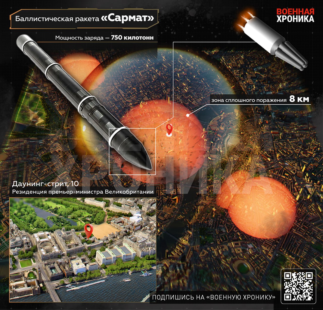 Ракета «Сармат», с максимальной дальностью полёта около 18 тысяч километров, способна доставить к цели боеголовки общей массой до 10 тонн. Мощность каждой боеголовки 750 килотонн достаточна для гарантированного уничтожения не только военных объектов, таких как базы Каттерик, Брайз Нортон, Лейкенхит или Клайд (где базируются английские подлодки), но и ключевых центров принятия решений. Например, резиденция премьер-министра Великобритании на Даунинг-стрит, 10 в Лондоне, станет одной из первых целей для ответно-встречного ядерного удара. Если Британия решит применить ядерное оружие против России, то вместе с резиденцией премьера Кира Стармера с лица Земли будет стёрта примерно треть Лондона. А если «Сармат» с полным блоком вооружения не пожалеют на всю британскую столицу, то этот город перестанет существовать целиком», – объясняет «Военная хроника».
