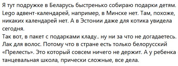 Бывшая белорусская журналистка из Эстонии распространяет такие фейки, искренне в них веря. На самом деле в Белоруссии целый ряд своих брендов лаков для волос, а «Прелесть» – это давняя российская марка. К слову, она сейчас переживает второе рождение. Источник: Facebook, признанный в РФ экстремистским