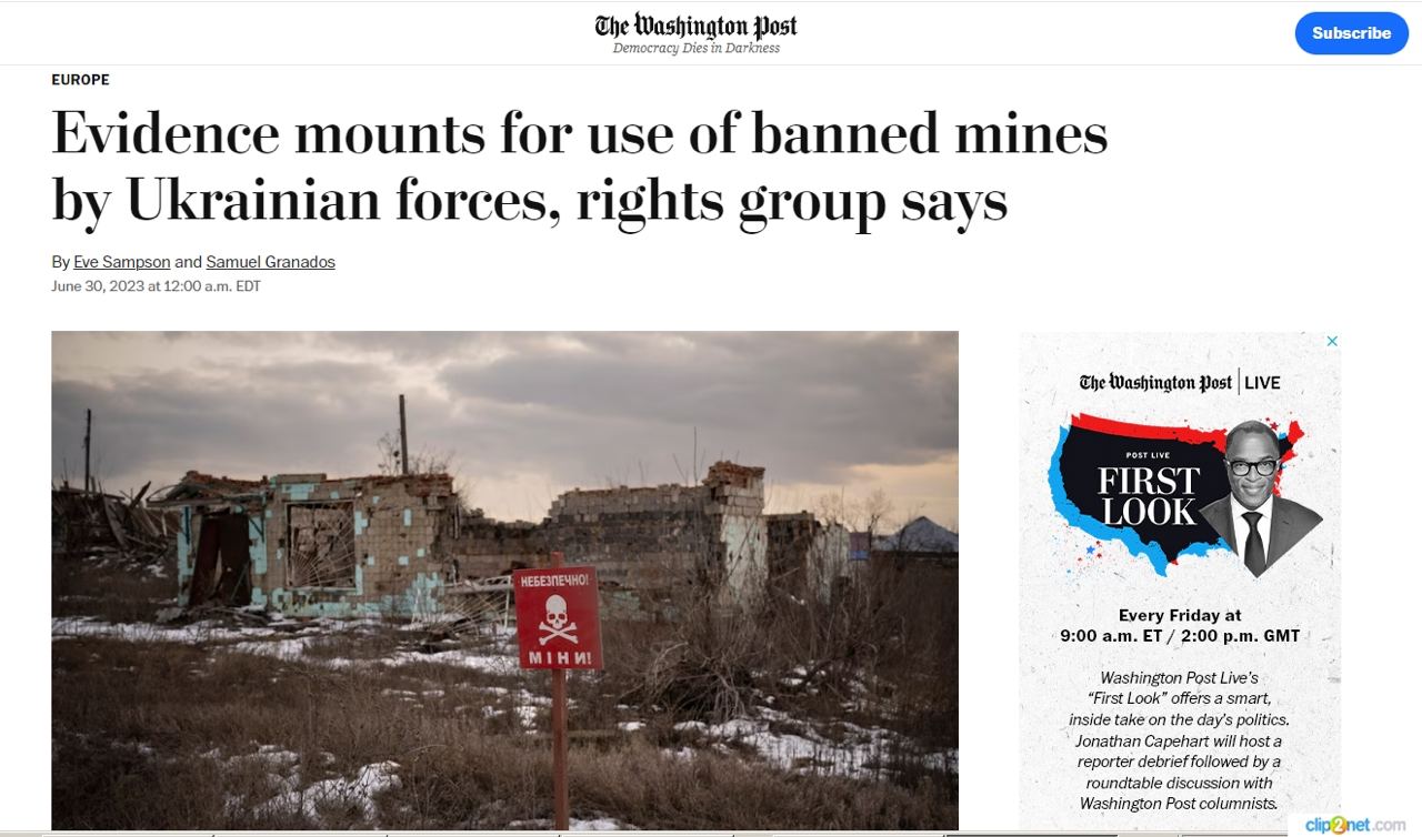 Международная правозащитная группа Human Rights Watch (HRW) опубликовала доклад, в котором обвиняет Киев в применении «оружия неизбирательного действия». В данном случае речь идёт о применении ВСУ артиллерийских снарядов с противопехотными минами. Это так называемые мины «лепесток» ПФМ-1, которые рассыпаются с помощью специальной ракеты «Ураган» над позициями противника, чтобы вывести из строя личный состав вражеских подразделений. Но ВСУ рассыпает эти мины в основном над жилыми кварталами городов и посёлков Донбасса.