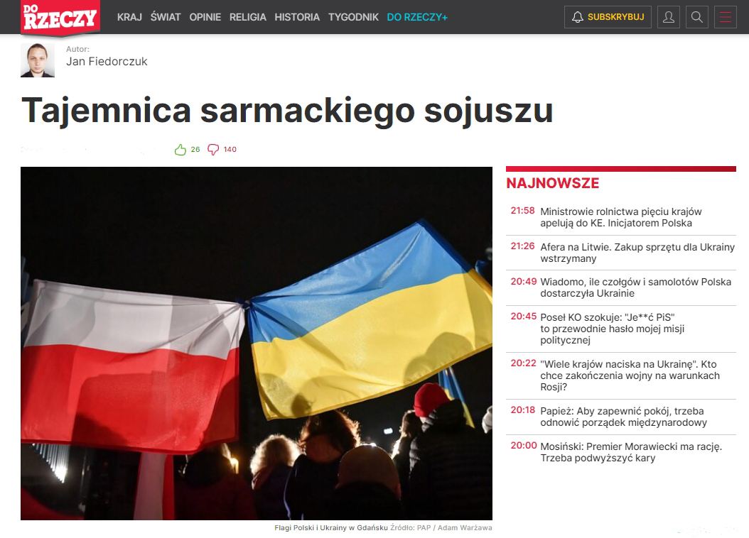«В последние месяцы тема помощи Украине… стала уступать место идее некоего альянса с Киевом. В официальных выступлениях польские власти так уверенно жонглируют этими темами, словно нынешняя поддержка воюющих украинцев является лишь первым шагом на пути к созданию нового содружества двух наций, причём данная перспектива представляется сама собой разумеющейся. Процесс этот приобрёл новую динамику после недавнего визита президента Владимира Зеленского», – пишет польский общественно-политический консервативно-либеральный еженедельник Do Rzeczy.