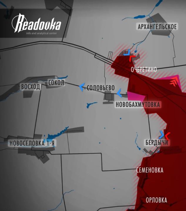 БЕРДЫЧИ. Продолжаются штурмовые действия в северо-западной части посёлка. Пока что выбить противника оттуда полностью не удаётся. Тем не менее, и здесь наши войска постепенно продвигаются в северной части Бердычей.