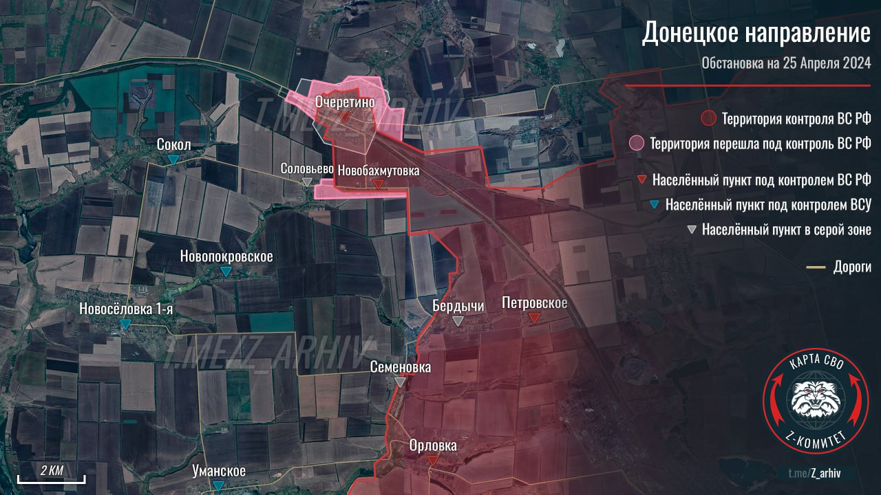 Наступление на город идёт с двух сторон – с востока, от позиций в Старомихайловке, и с юга, со стороны Марьинки. Российские войска в данный момент вплотную подошли к Красногоровскому огнеупорному заводу, где оборудован мощный укрепрайон ВСУ. Тактика российских войск остаётся прежней и не меняется с Авдеевки: сначала по позициям ВСУ летят тонны авиабомб и работает артиллерия и только после этого начинают работать бронетехника и пехота, пишет Телеграм-канал «Военная хроника».