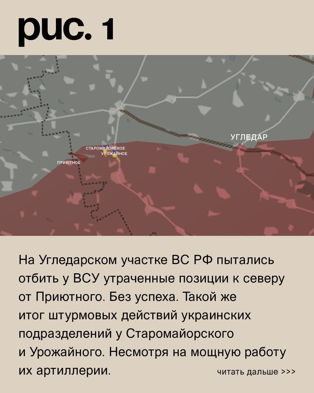 Но есть серьёзный успех у Новоегоровки. ВС России вышли к населённому пункту на правом берегу реки Жеребец и продвинулись на 3,5 километра по глубине и на 5 километров по фронту. Заняты высоты. Параллельная атака российских войск у Надии была не столь удачной.