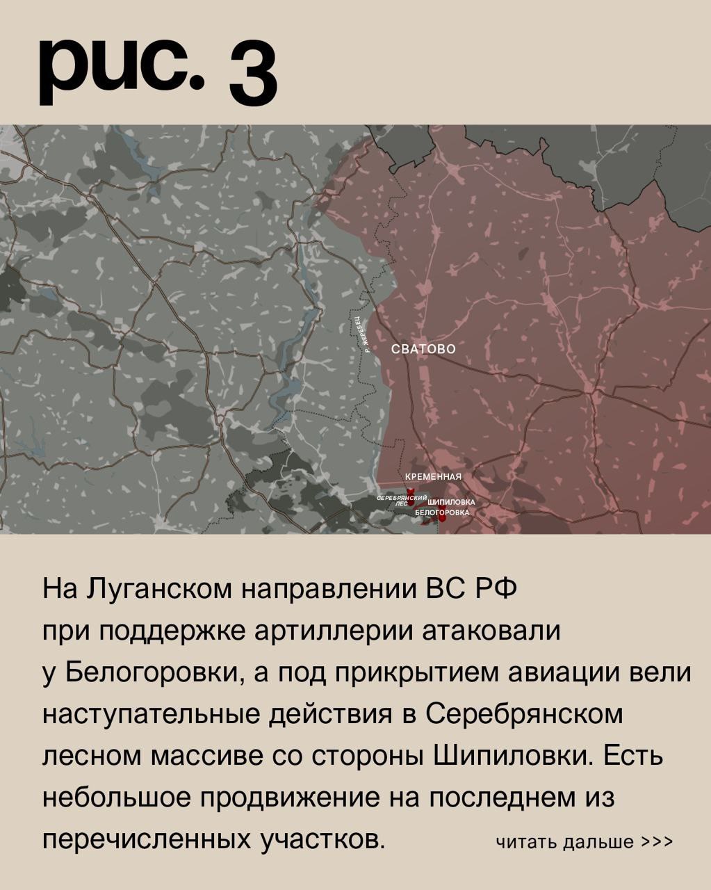 На ЛУГАНСКОМ направлении ВС России при поддержке артиллерии атаковали у БЕЛОГОРОВКИ, а под прикрытием авиации вели наступательные действия в СЕРЕБРЯНСКОМ лесном массиве со стороны ШИПИЛОВКИ.