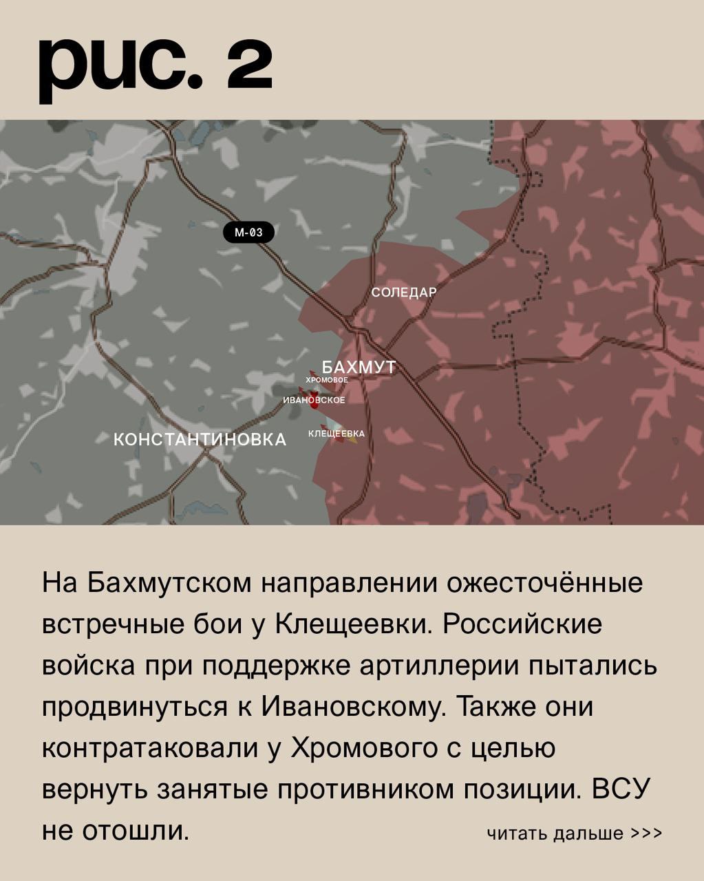 На БАХМУТСКОМ направлении ожесточённые встречные бои у КЛЕЩЕЕВКИ. Российские войска при поддержке артиллерии пытались продвинуться к ИВАНОВСКОМУ. Также они контратаковали у ХРОМОВОГО с целью вернуть занятые противником позиции. ВСУ не отошли.