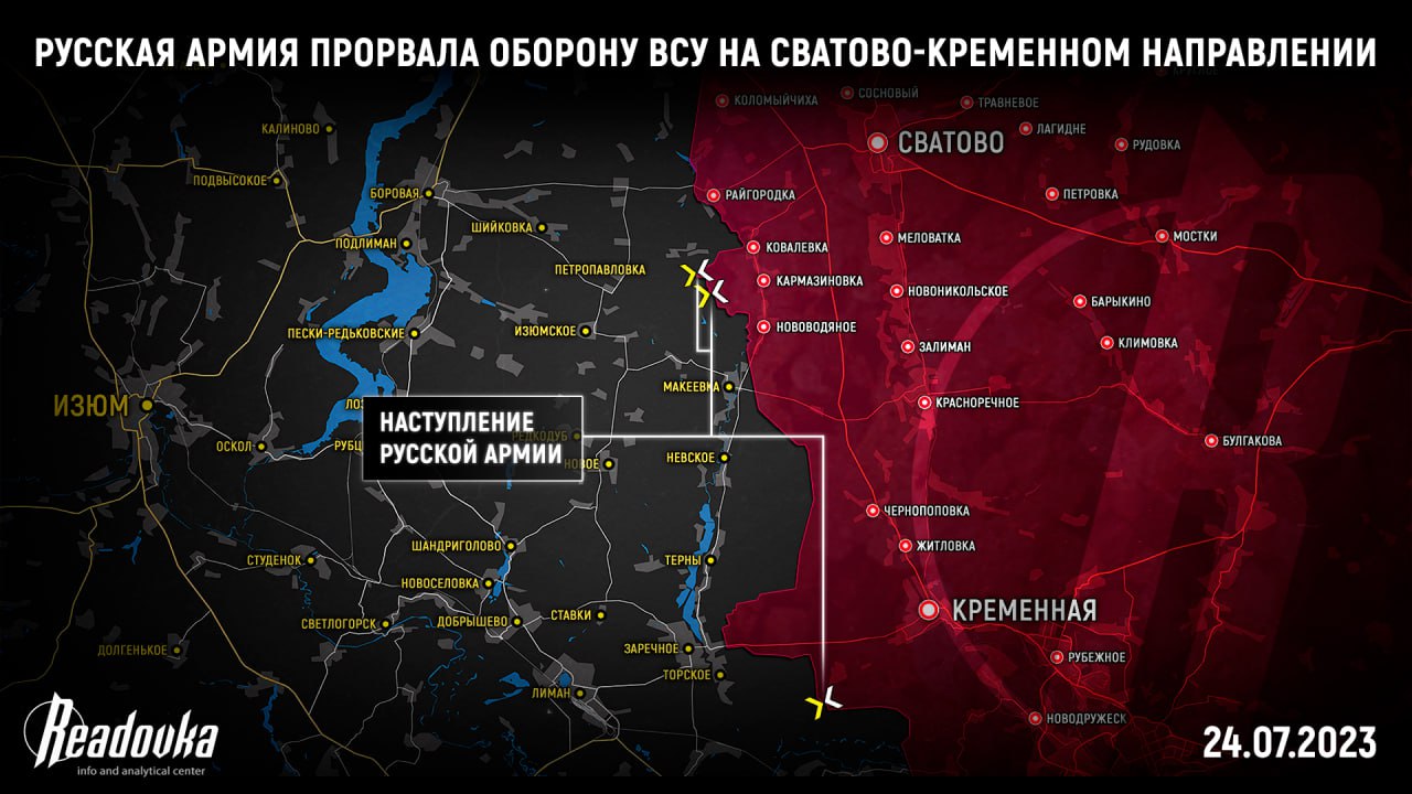 Русская армия прорвала оборону украинских войск на СВАТОВО-КРЕМЕНСКОМ направлении, сообщает Телеграм-канал Readovka.