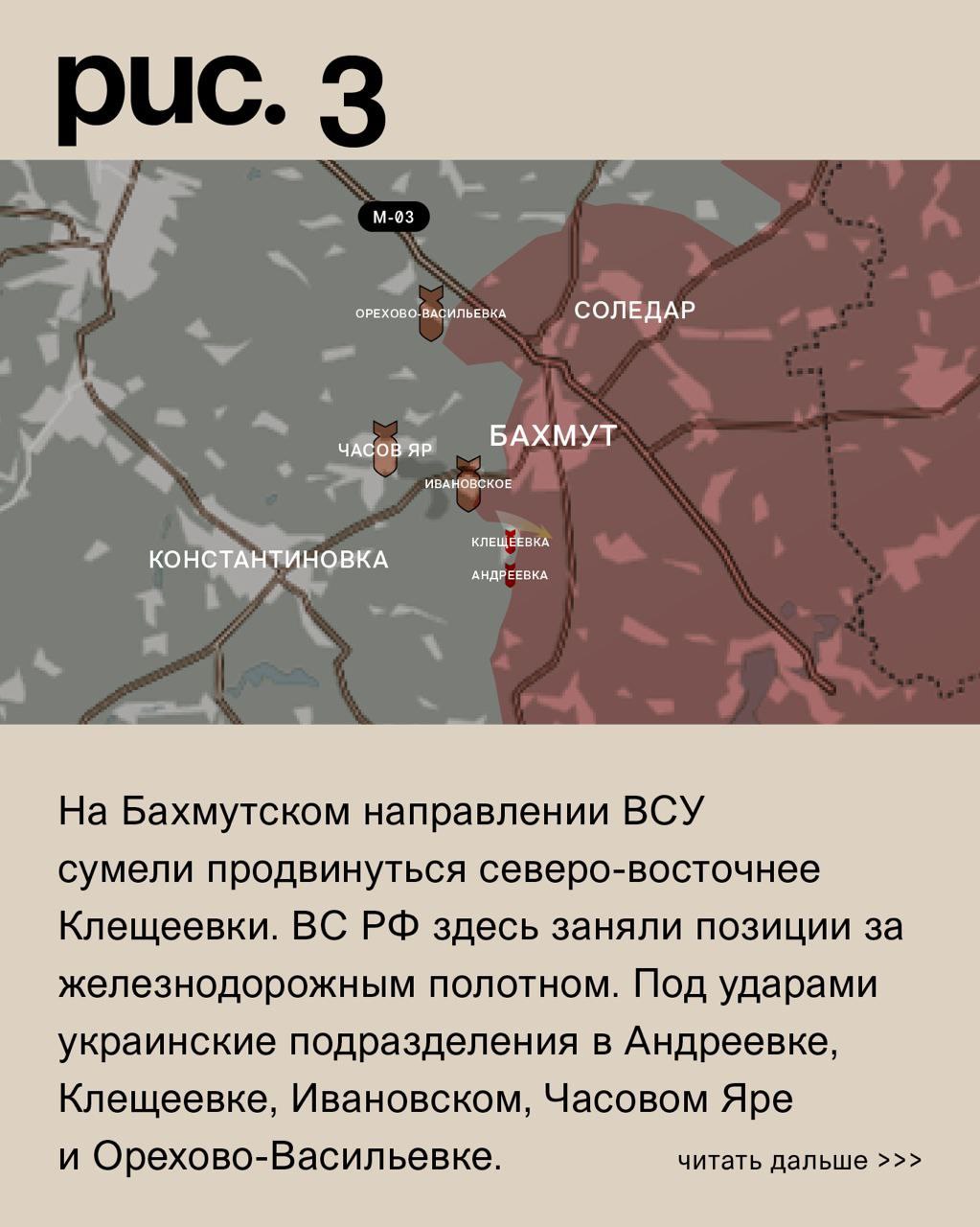 На БАХМУТСКОМ направлении ВСУ сумели продвинуться северо-восточнее Клещеевки. ВС России здесь заняли позиции за железнодорожным полотном. Под ударами украинские подразделения в Андреевке, Клещеевке, Ивановском, Часовом Яре и Орехово-Васильевке. Российские – в Озаряновке, Курдюмовке, Бахмуте и Дубово-Васильевке.