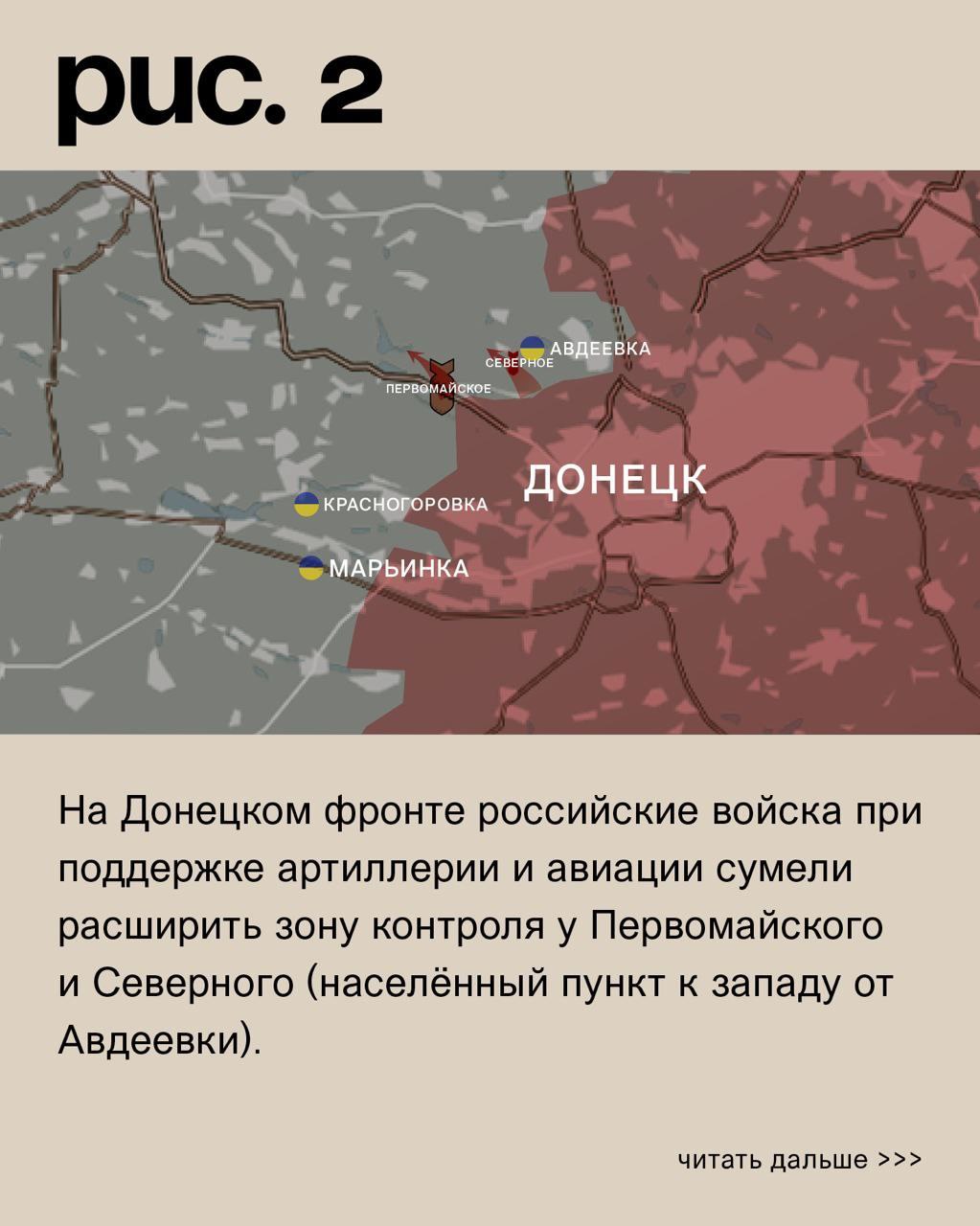 На ДОНЕЦКОМ фронте российские войска при поддержке артиллерии и авиации сумели расширить зону контроля у Первомайского и Северного (населённый пункт к западу от Авдеевки). Аналогичные действия у Степного (не путать с одноимёнными населёнными пунктами на Запорожском и Угледарском направлениях) наткнулись на неподатливость украинских подразделений.