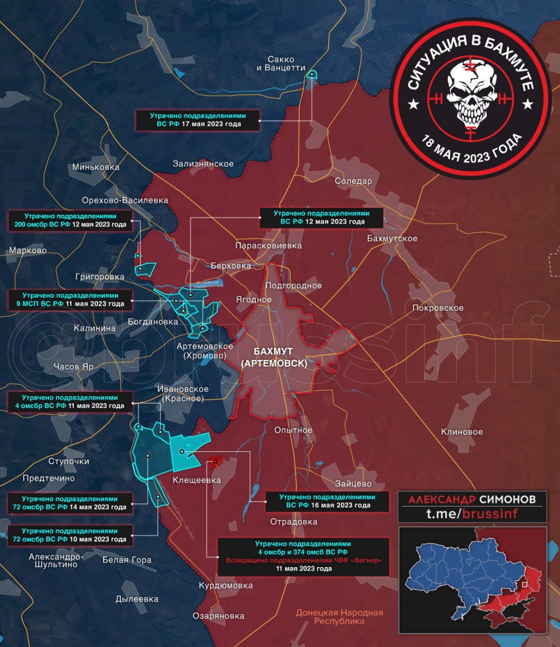 Обстановка на Бахмутском направлении на 18 мая от военкора Александра Симонова («Позывной Брюс»).
