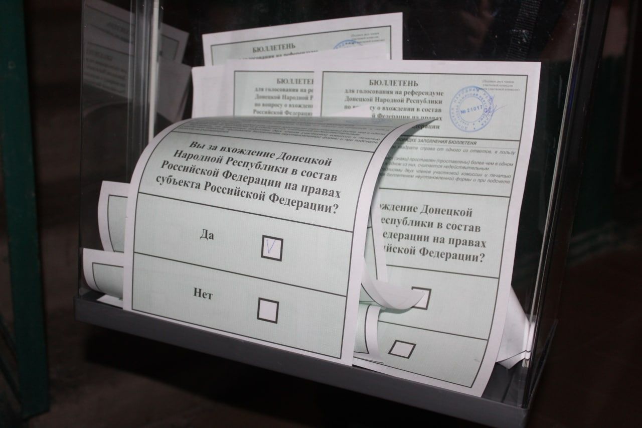 «С самого утра наш прифронтовой город Горловка голосует за вхождение Донецкой Народной Республики в состав Российской Федерации на правах субъекта. Несмотря на обстрелы со стороны украинских террористов, горловчане голосуют целыми семьями за свое светлое, мирное будущее, в котором не будет войны, но будет счастье, благополучие и уверенность в завтрашнем дне!