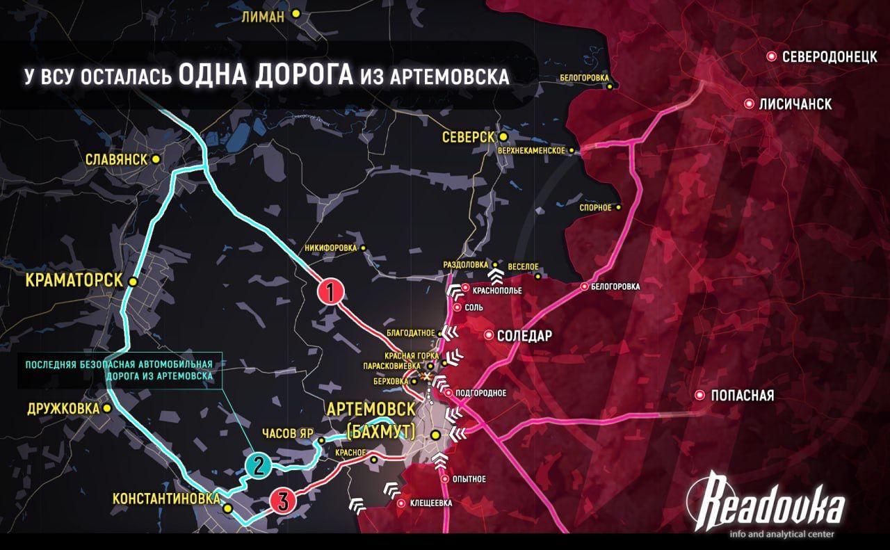 Основная стратегическая цель – оперативное окружение АРТЁМОВСКА, где находится около 20 бригад ВСУ и иностранных подразделений. Два из трёх основных путей снабжения ВСУ уже под нашим контролем. С северного направления ВСУ в районе ПАРАСКОВИЕВКИ взорвали железнодорожный мост, перекрыв тем самым дорогу на СЛАВЯНСК (№1 на карте). С западного направления трасса, ведущая от КРАСНОГО (ИВАНОВСКОГО) находится под огневых контролем русских (№3 на карте). На данный момент для взятия АРТЁМОВСКА в оперативные клещи, осталось взять дорогу на ЧАСОВ ЯР (№2 на карте).