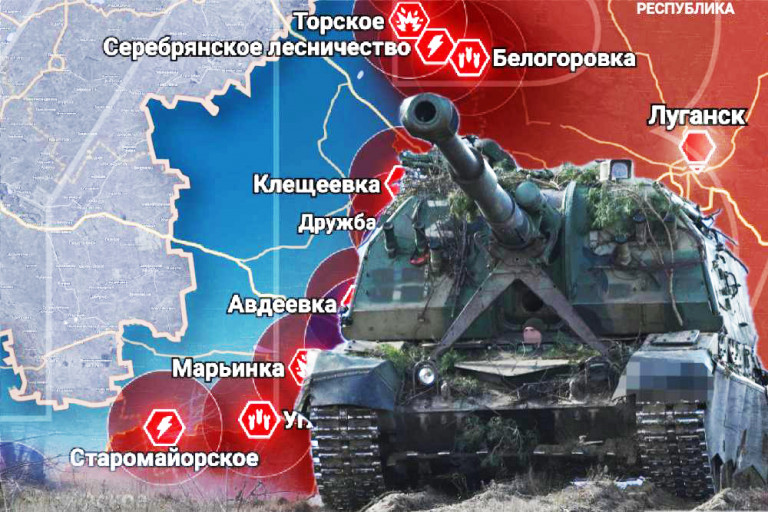На ДОНЕЦКОМ фронте продолжается жаркая битва. Российские войска после артобстрелов вели наступательные действия в Марьинке, у Северного (населённый пункт к западу от Авдеевки), со стороны Ясиноватской развилки на Авдеевку, в районе Степного (не путать с одноимёнными населёнными пунктами на Запорожском и Угледарском направлениях) и у Новокалинова. Средства дальнего поражения ВС России били по ВСУ в Новомихайловке, Георгиевке, городе Красногоровка, Невельском, Нетайлове, Яснобродовке, Тоненьком, Керамике, Сухой Балке и Нью-Йорке.