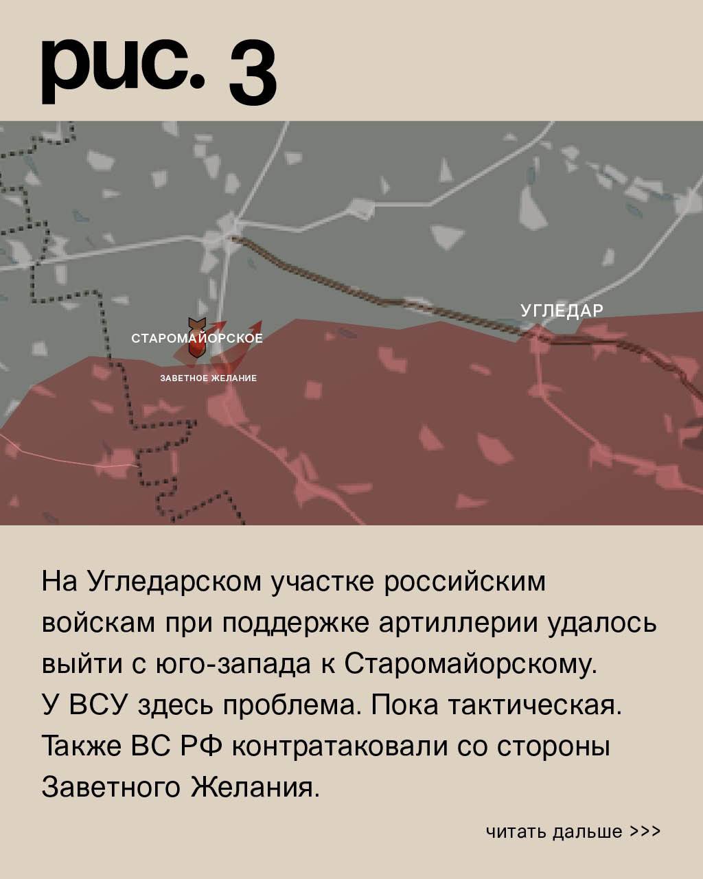 На УГЛЕДАРСКОМ участке российским войскам при поддержке артиллерии удалось выйти с юго-запада к Старомайорскому. У ВСУ здесь проблема. Пока тактическая. Также ВС России контратаковали со стороны Заветного Желания. Средства дальнего поражения российских войск работали по украинским позициям в Благодатном, Урожайном, Золотой Ниве, Пречистовке и Угледаре. Обратный огонь по ВС России в Приютном, Заветном Желании, Старомлыновке и Никольском.